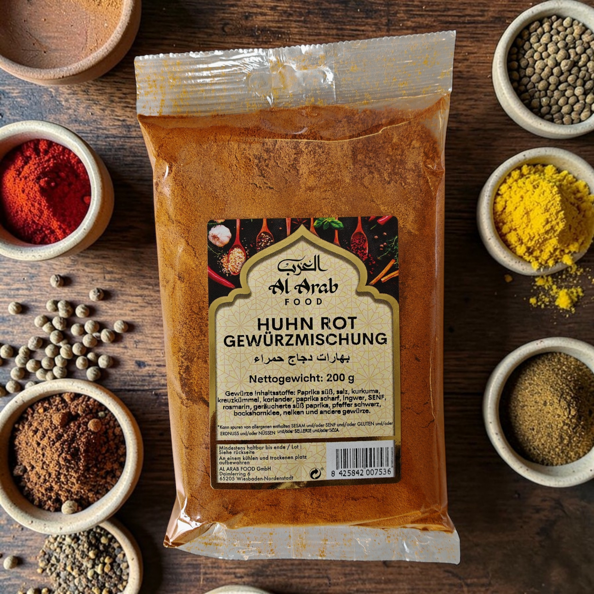 Bringen Sie die Geheimnisse der orientalischen Grillkunst in Ihre Küche. Die "Huhn Rot" Gewürzmischung von Al Arab Food ist eine perfekt abgestimmte Komposition aus edelsüßem Paprika, Kurkuma und feinen Kräutern. Sie verleiht Ihrem Geflügel eine appetitliche rote Farbe und einen herzhaft-würzigen Geschmack mit einer dezenten Schärfe.